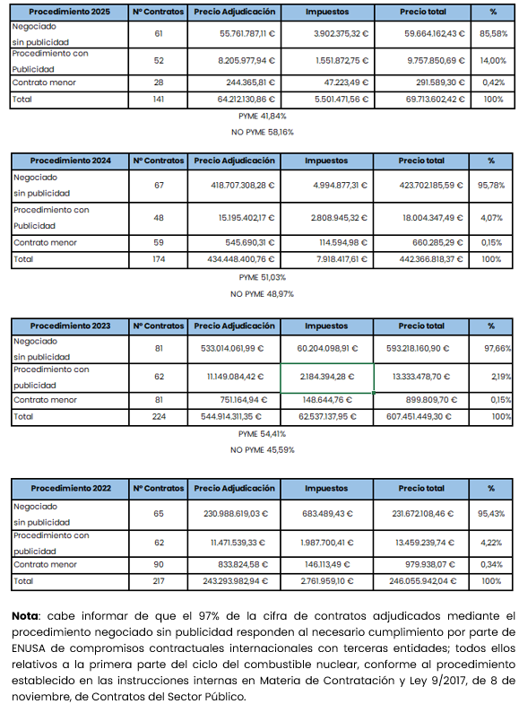En relación con la información a que se refiere el Art. 8.1.a, párrafo 2º, de la Ley de Transparencia, es de advertir que los procedimientos de adjudicación previstos en la legislación de contratos del sector público (Subasta, Concurso, Negociado, etc.) no son de aplicación a ENUSA, que se rige a estos efectos por sus propias instrucciones internas en materia de contratación, publicadas en su página Web corporativa.